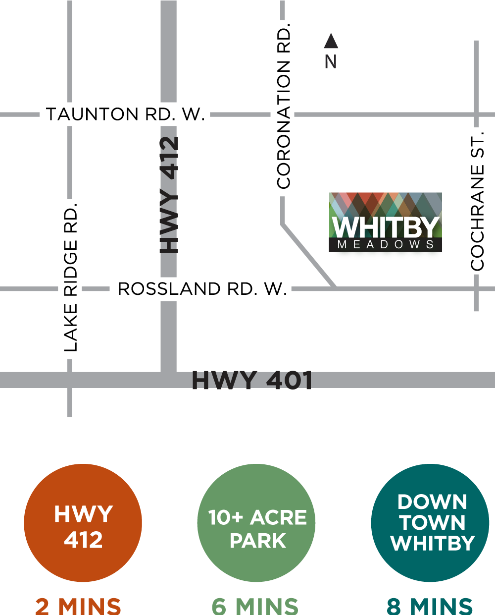 Imagine meeting friends at a downtown restaurant, zipping along the trails at the Heber Down Conservation Area during a family bike ride and a visit to the shopping mall to update those winter wardrobes. Whitby Meadows is an established community ideally situated next to the new Highway 412, which connects you to Highways 401 and 407. Close to top-rated schools, parks, shops, restaurants, trails and the vibrant waterfront, when you live at Whitby Meadows, everything your family needs is right outside your front door.